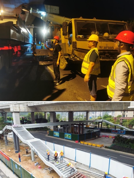 由于人行天橋項目建設所處的位置地下含高壓線等管線,施工環(huán)境較為復雜,且又處在交通通行量大的東環(huán)高速高架橋下,由于空間受限,鋼箱梁吊裝與高架橋最近的距離僅有5公分,吊裝難度極大。為此,我們采取雙吊車協(xié)同施工、錯峰施工和夜間施工的辦法。為確保施工安全,市政集團從上至下高度重視,由集團領導帶隊,項目總工及各職能部門主要人員齊上陣,從交通協(xié)調,運梁車跟隨指導,安全措施落實及現(xiàn)場架梁的線位等多方面進行把控,主要負責人靠前指揮,帶領黨員干部及時協(xié)調解決吊裝過程中遇到的問題,充分發(fā)揮出黨支部戰(zhàn)斗堡壘和黨員的模范帶頭作用。
