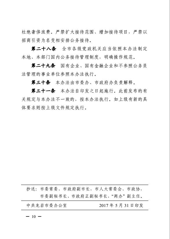 市委辦、市政府辦關(guān)于印發(fā)《龍巖市黨政機關(guān)國內(nèi)公務(wù)接待管理暫行辦法》的通知(巖委辦發(fā)【2017】20號)