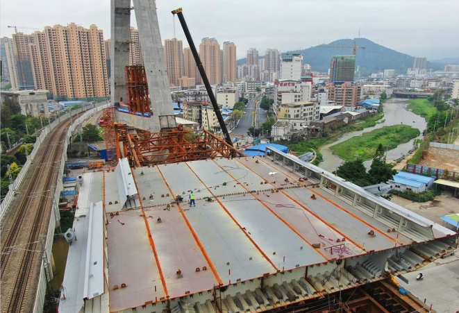 大橋鋼箱梁工程還有19片箱梁,鋼箱梁總長340米,每片質(zhì)量平均290噸,計劃8月初全部完成吊裝。與此同時,主塔第一次轉(zhuǎn)體計劃于4月中旬實(shí)施,第二次轉(zhuǎn)體計劃在8月底,確保年底大橋通車。