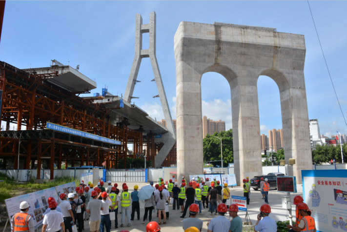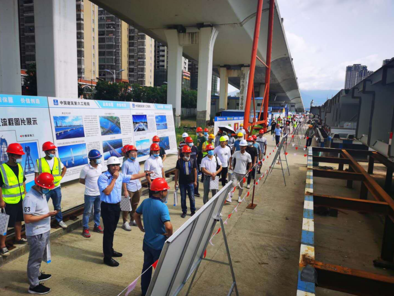 2020年6月28日,由龍巖城市發(fā)展集團有限公司主辦,龍巖市政建設集團有限公司(市城投公司)承辦,北京鐵研建設監(jiān)理有限公司、中國建筑第六工程局有限公司、中冶(上海)鋼結構科技有限公司協(xié)辦的龍巖大道高架橋項目質(zhì)量安全標準化觀摩會在龍巖大道高架橋主橋鋼箱梁工程現(xiàn)場舉行。觀摩會分拼裝區(qū)域、提升站區(qū)域、頂推滑移區(qū)域、步履滑移區(qū)域及主橋轉體區(qū)域分別展示了龍巖大橋主橋鋼結構拼裝、提升、弧形頂推滑移、步履滑移等新工藝及主塔“水平二次轉體”、鋼箱梁頂推、斜拉索施工技術