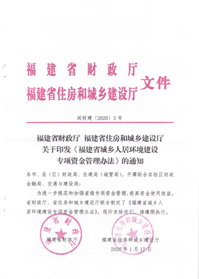 福建省財(cái)政廳福建省住房和城鄉(xiāng)建設(shè)廳關(guān)于印發(fā)《福建省城鄉(xiāng)人居環(huán)境建設(shè)專項(xiàng)資金管理辦法的通知》(閩財(cái)建[2020]3號(hào))